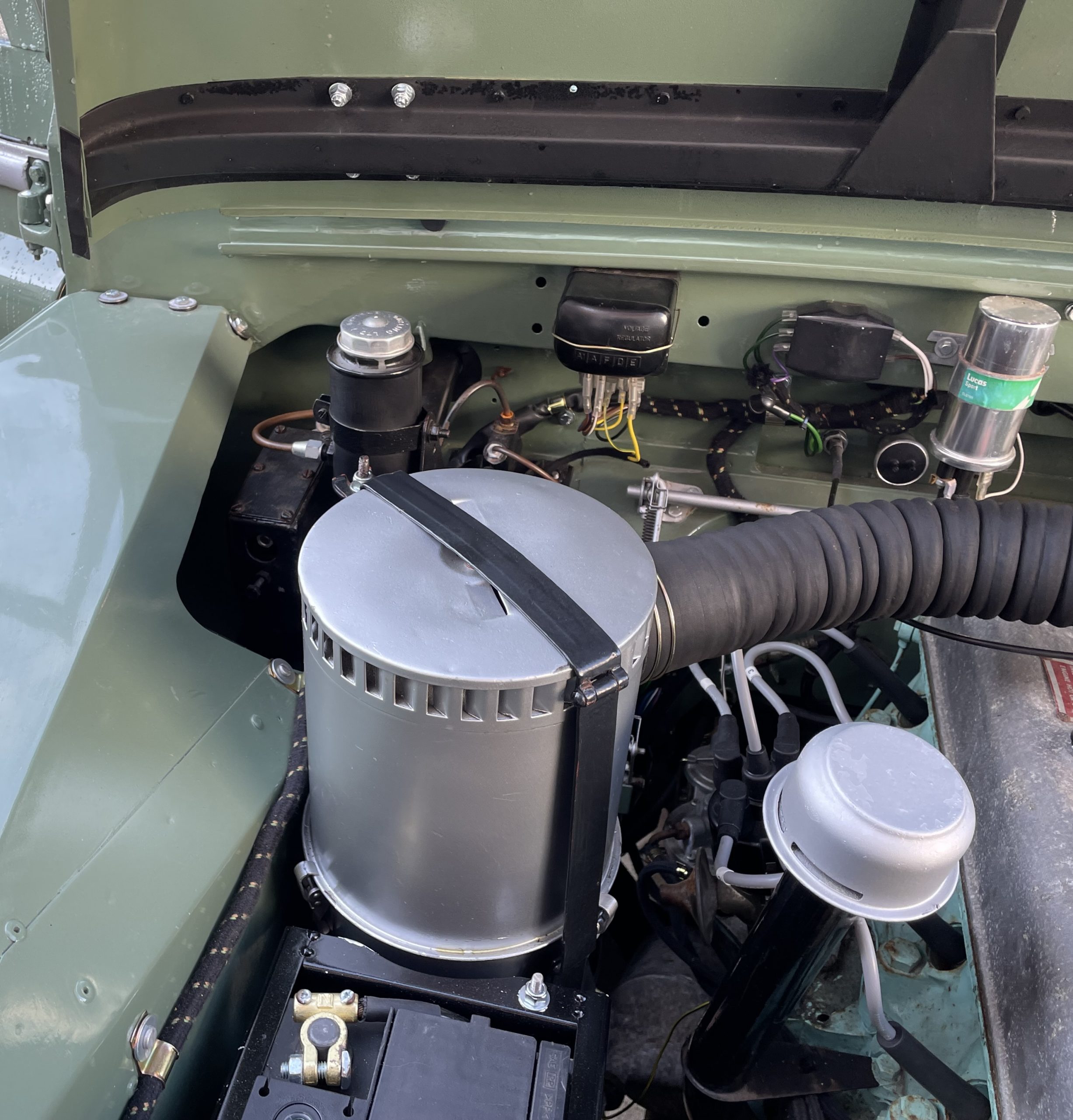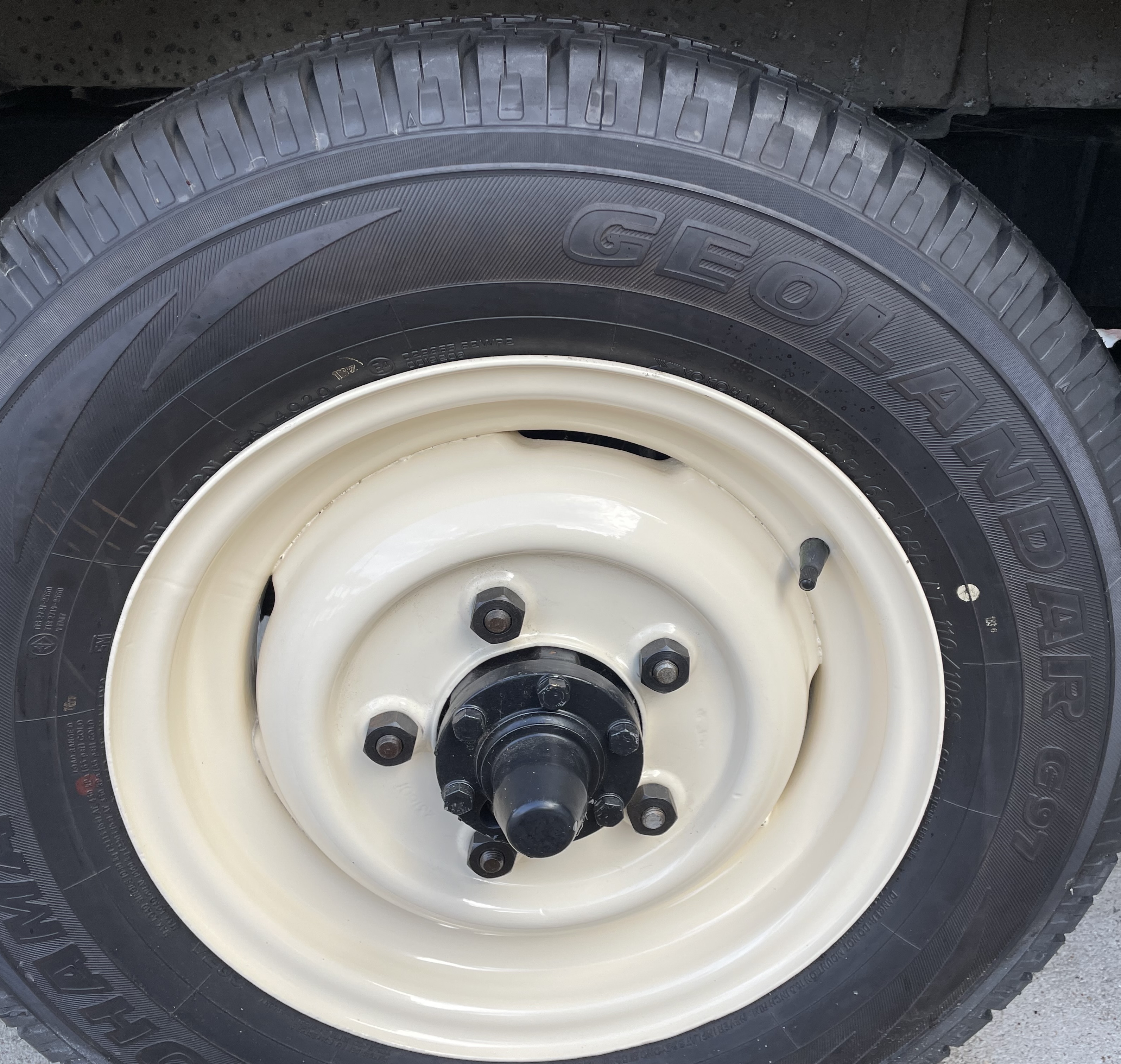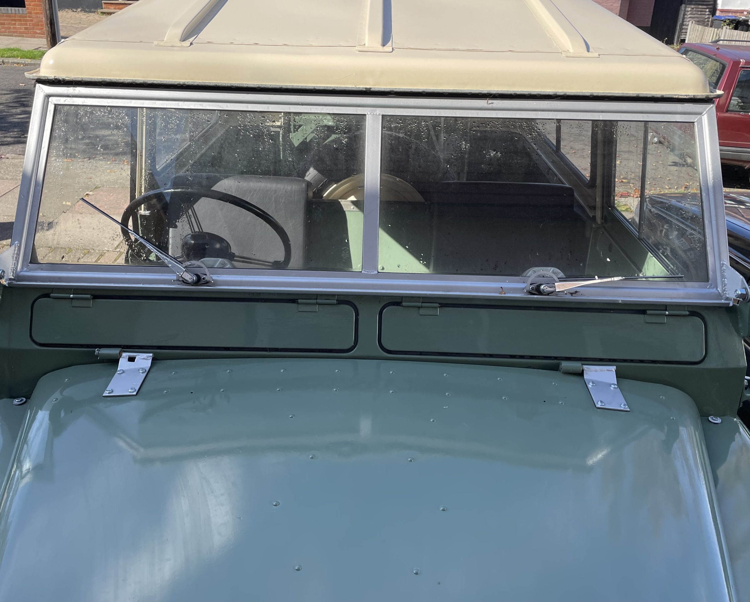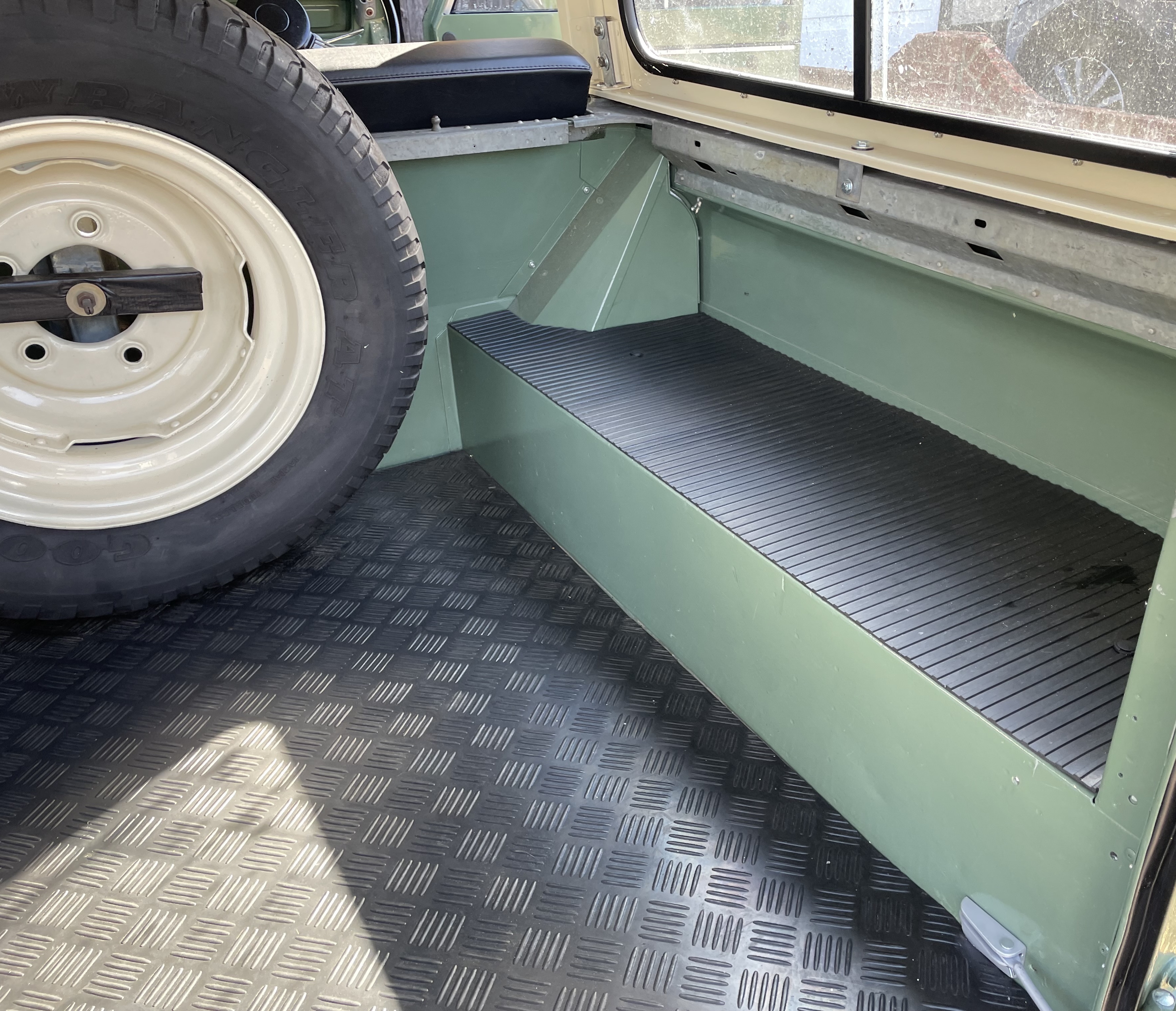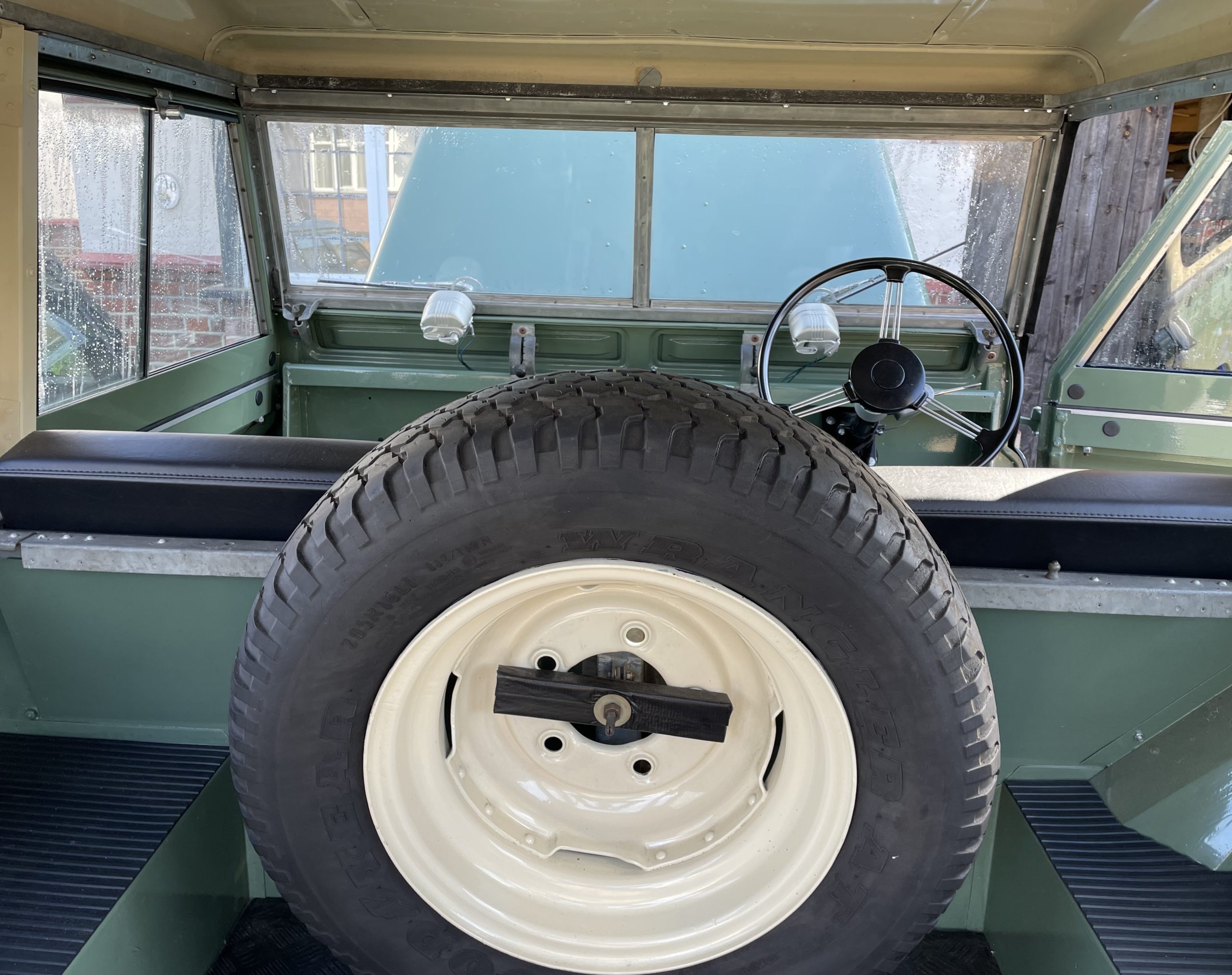 Wheels; These are the original 272309 pattern 5.5/16 inch rivetted steel wheels, with good condition off-road tyres. Spare is located on the bulkhead. Wheels grit blasted zinc primed and powder coated Limestone and refitted with a new wheel nuts.