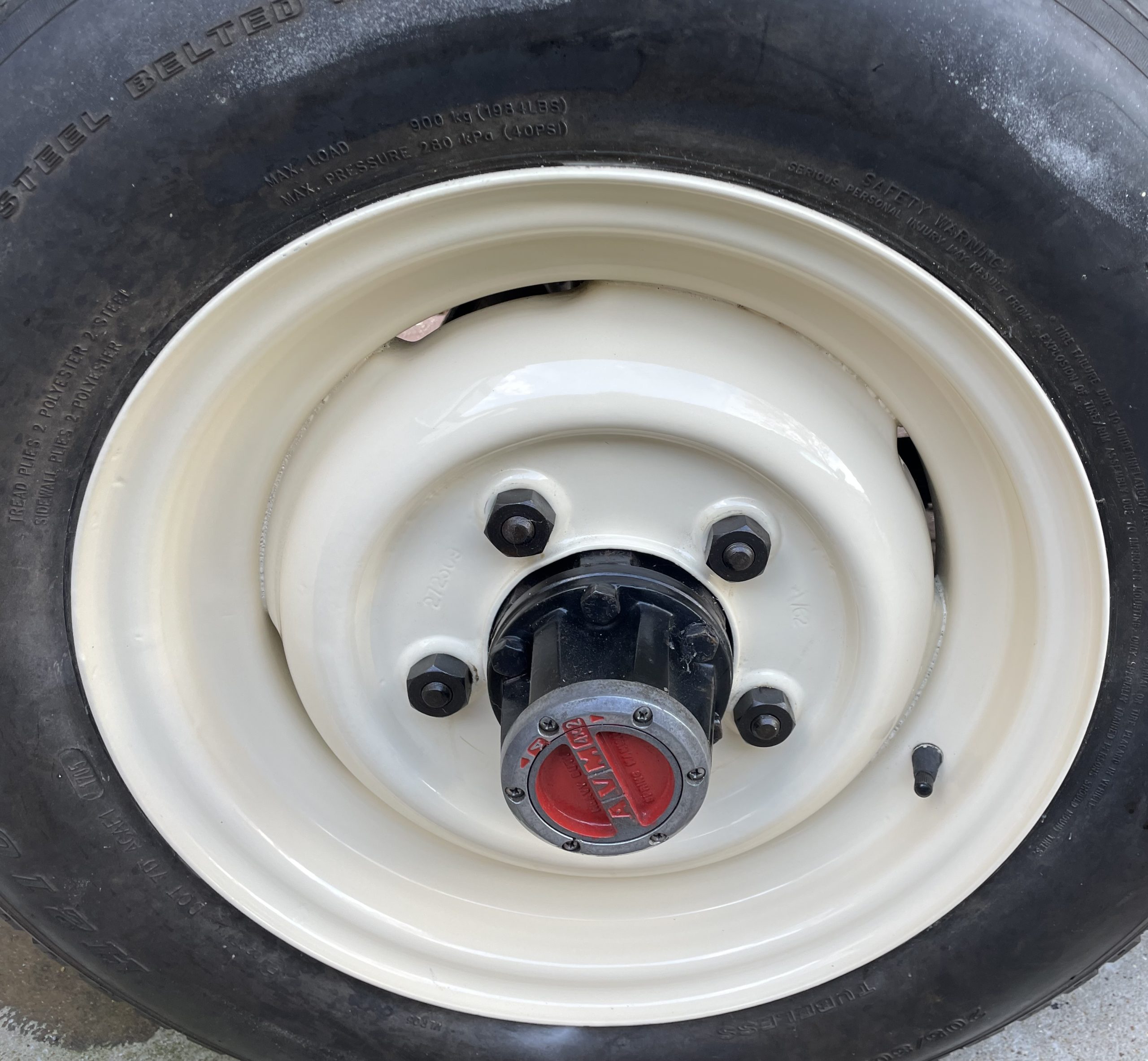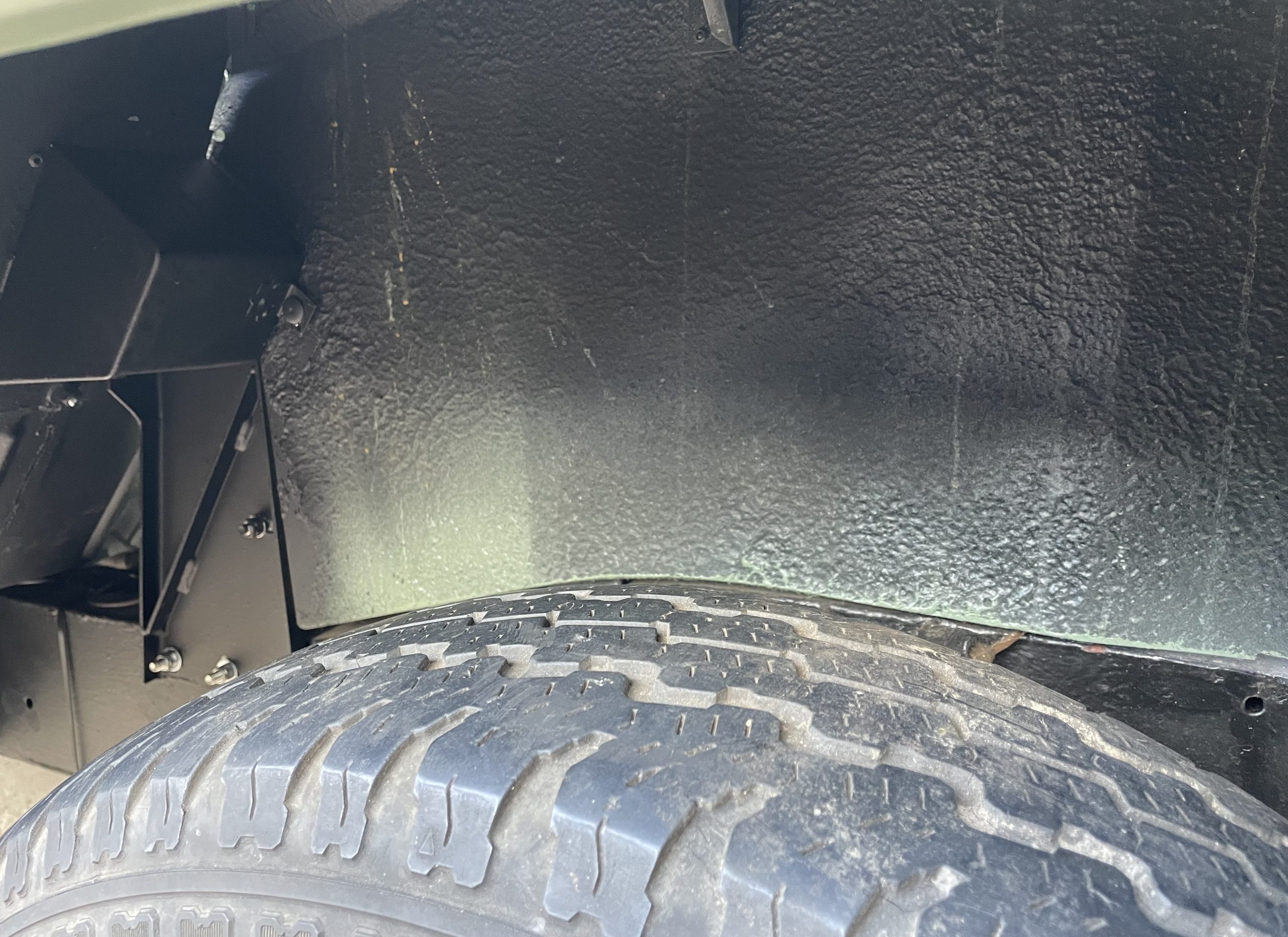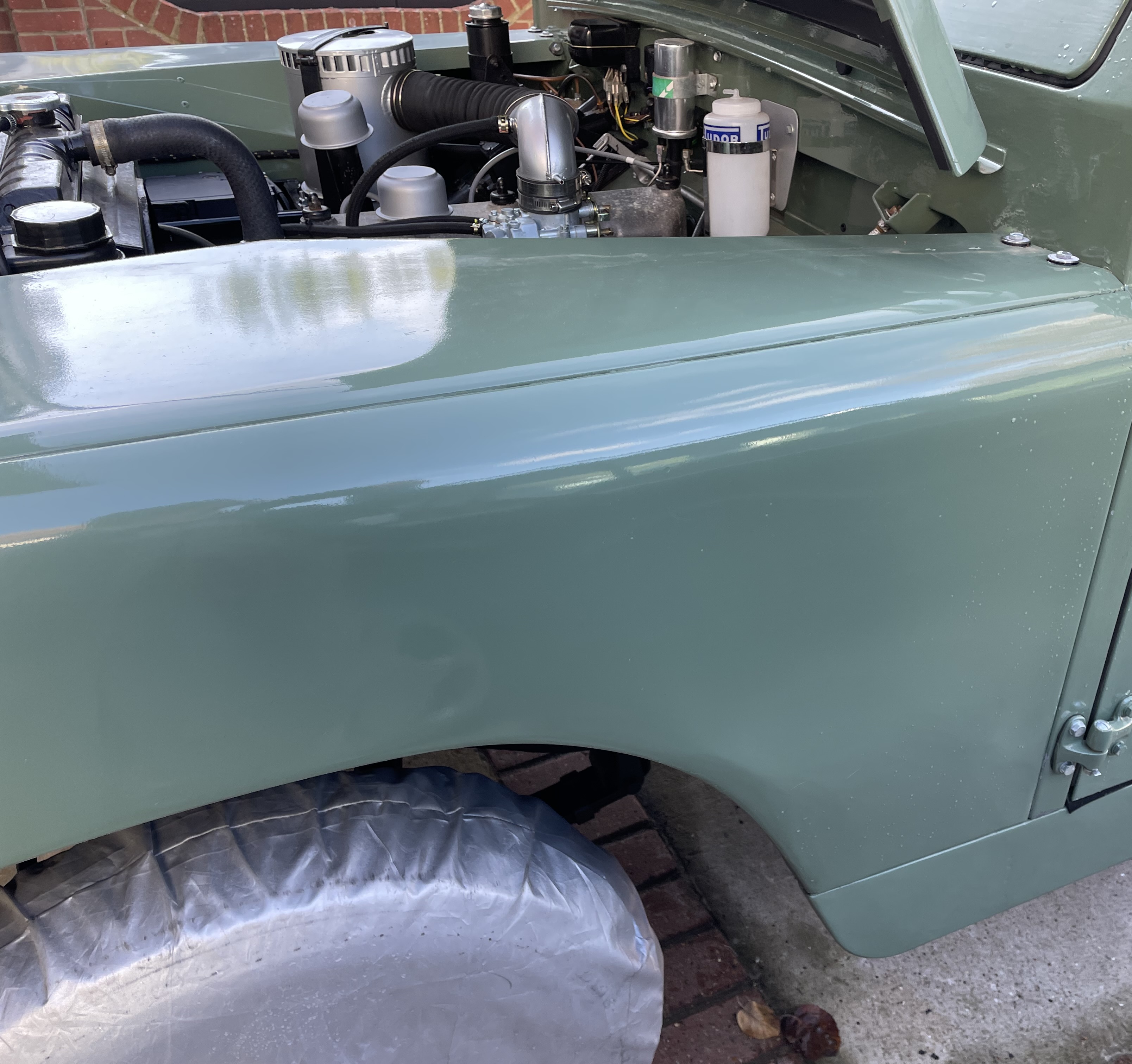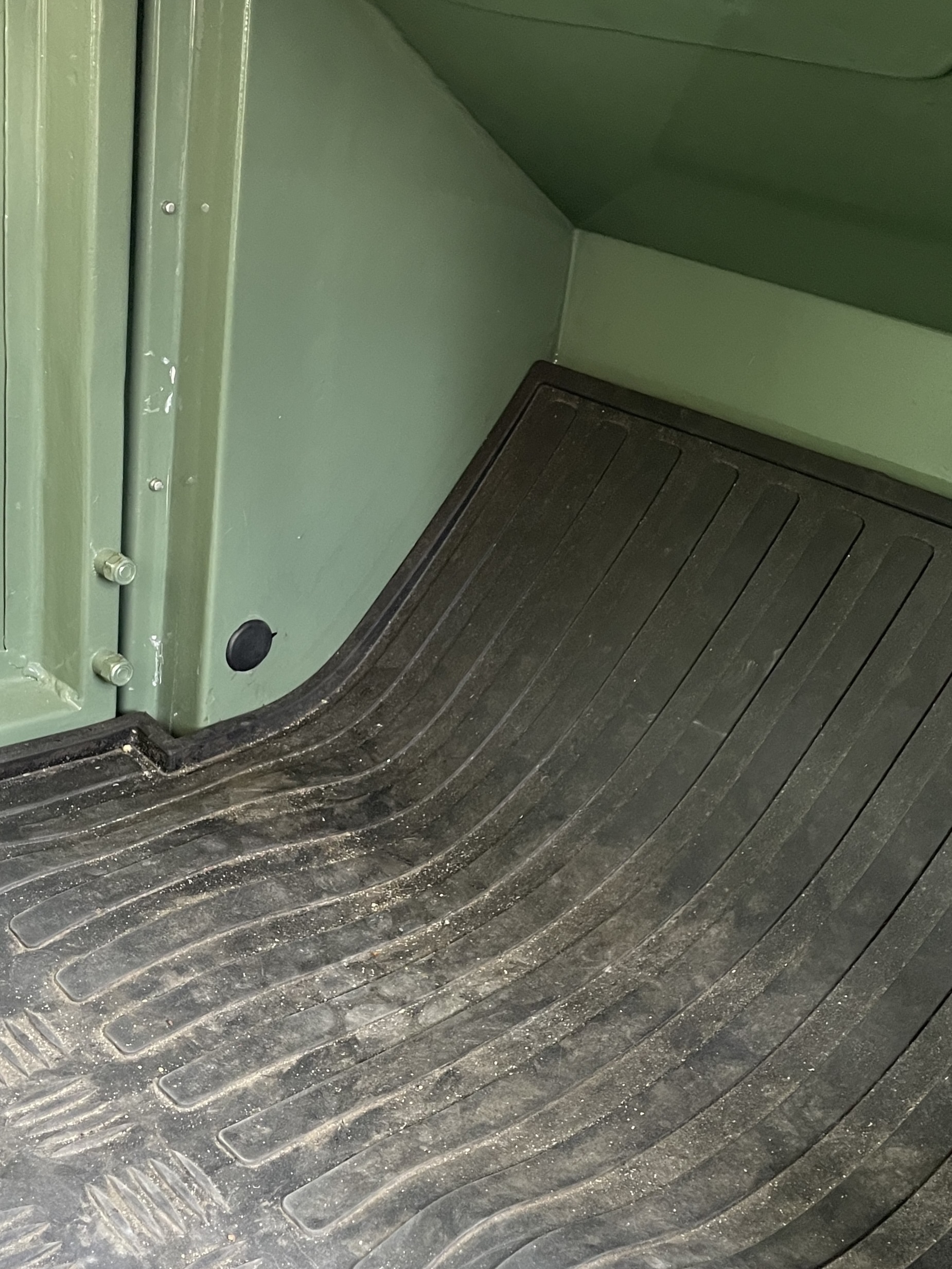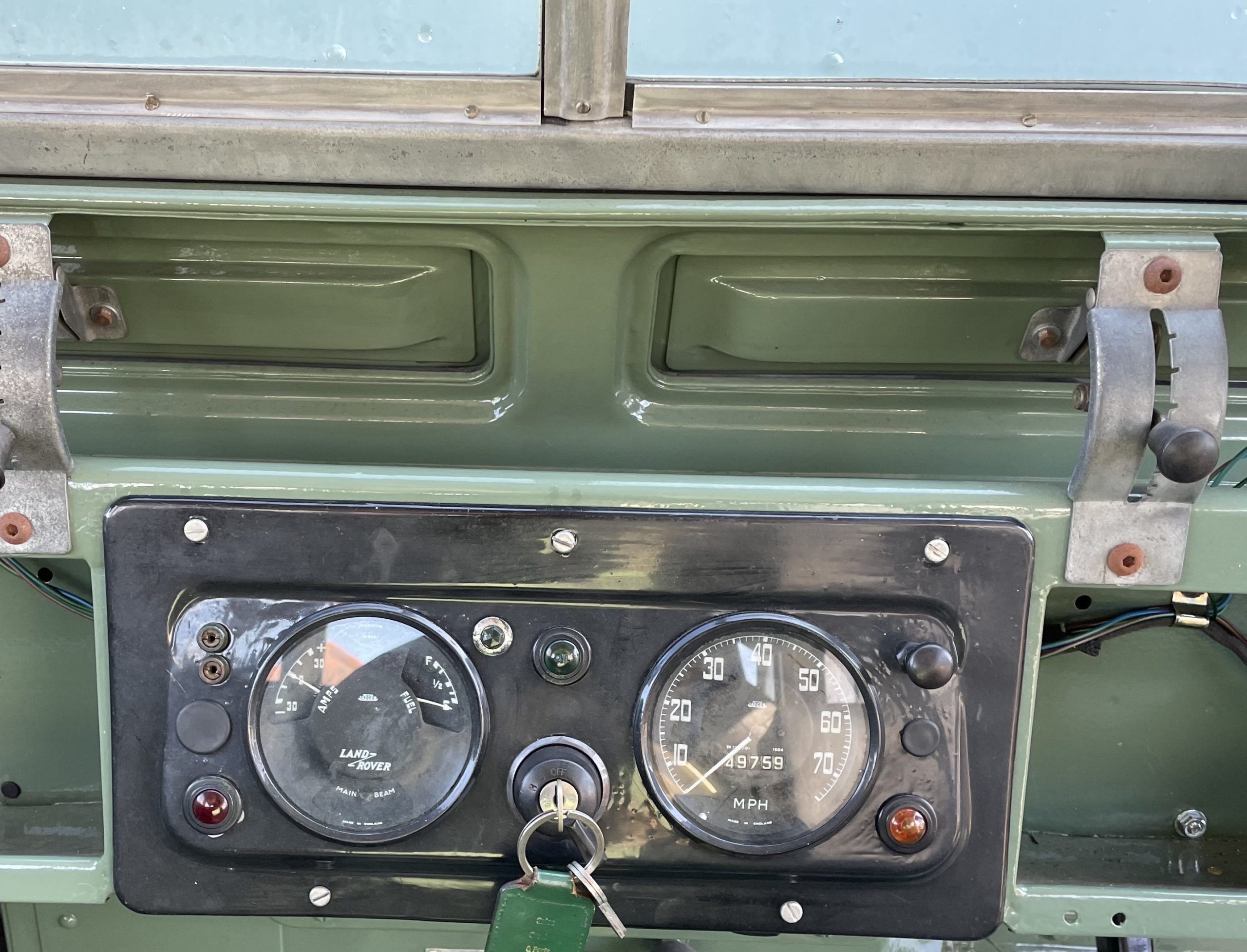 Wheels; These are the original 272309 pattern 5.5/16 inch rivetted steel wheels, with good condition off-road tyres. Spare is located on the bulkhead. Wheels grit blasted zinc primed and powder coated Limestone and refitted with a new wheel nuts.