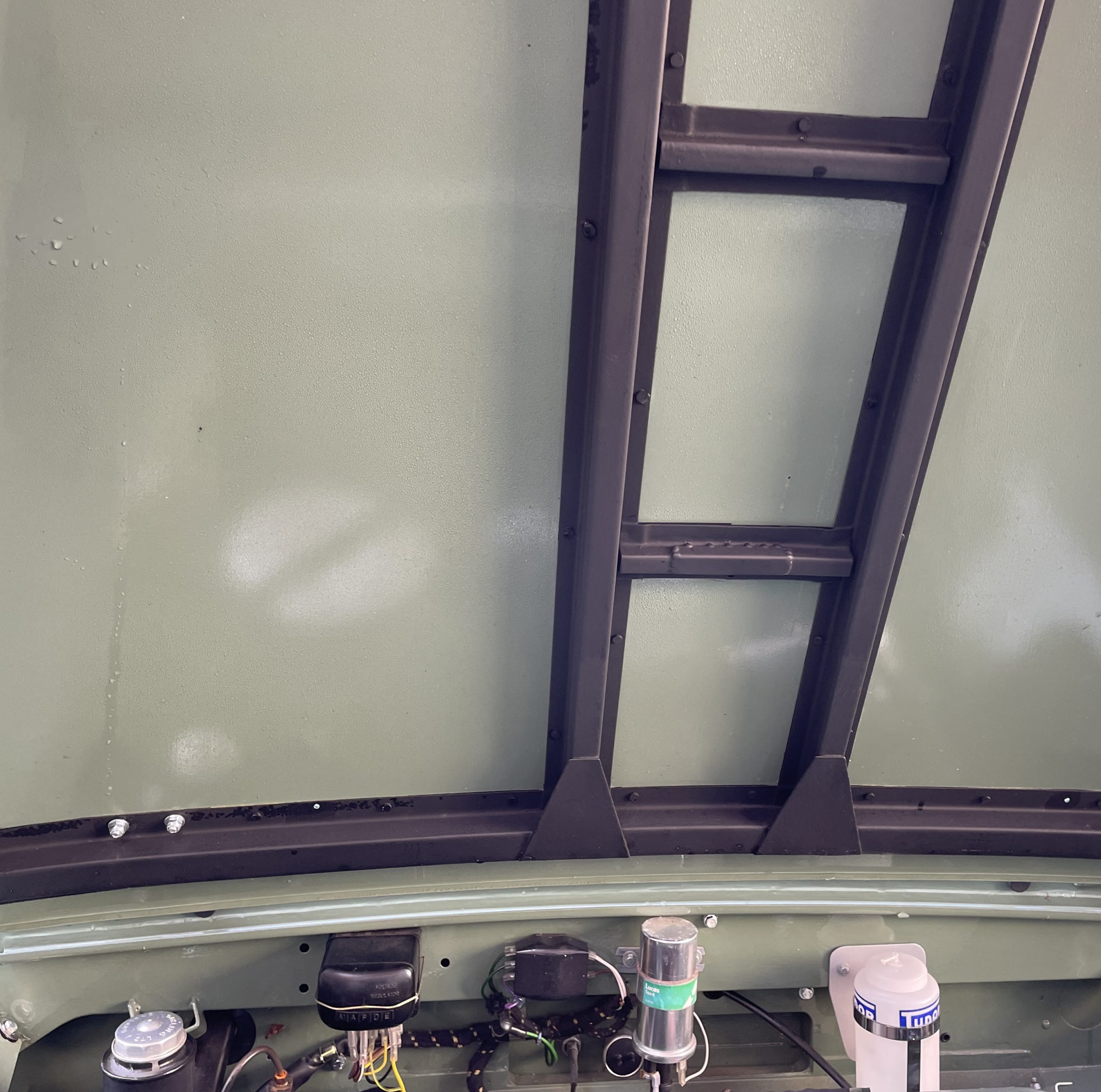 Bulkhead: – removed and renovated on a jig, so corrosion issues sorted and should be good for many years. Internal voids sprayed with rust protection. Nb – bulkhead ‘A’ pillars and door tops now have access holes incorporated for easy future rust proofing treatment in these areas that are commonly subject to corrosion (blanked off with grommets as seen in pics).