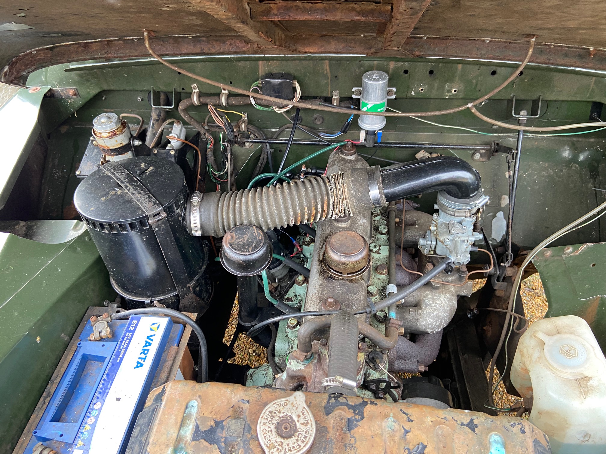 Tow bar, Rear Door wheel carrier, dash light, Light lenses and bulbs, Jack and handle, Points – electronic ignition easily removed, Fuel sender unit, water thermostat, water temp transmitter, oil filter seals, seat straps and nuts (spare), pedal box gaskets, wing mirror glass, Smith clock (reconditioned), new headlamps and surrounds, headlamp wiring for direct battery feed, Fuel return gasket. Spare wheel hub x 2, full all-weather cover and Paintman bronze green enamel paint, undercoat and thinners.